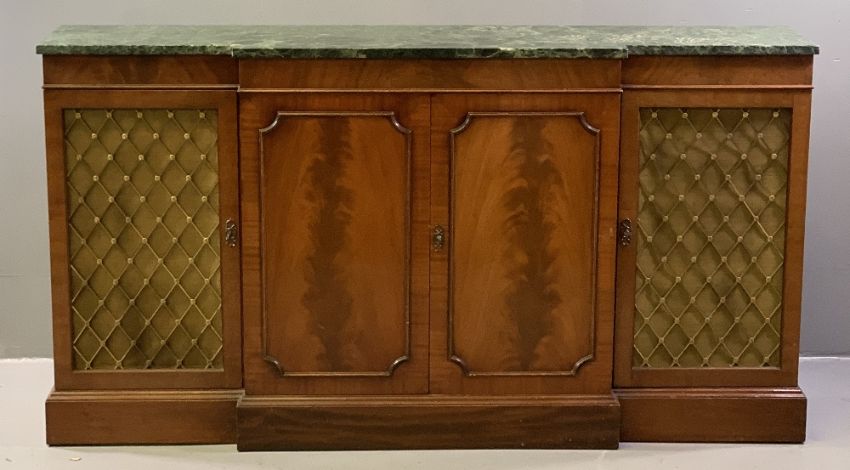 REPRODUCTION MAHOGANY BREAKFRONT SIDEBOARD with green marble top, twin central panelled doors with interior shelving and flanking twin outer doors with metal grills, on a plinth base, 89cms H, 169cms W, 35cms D
