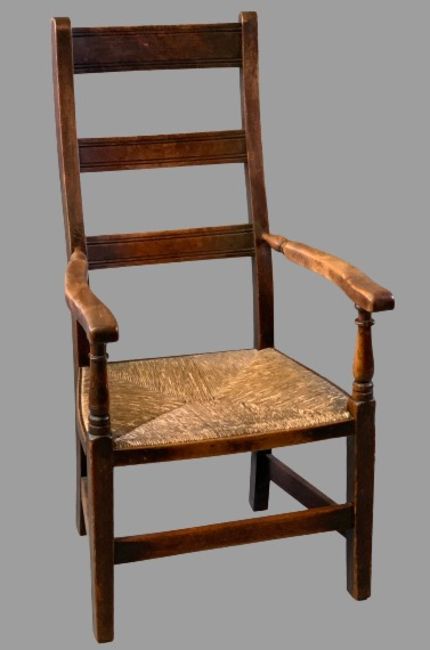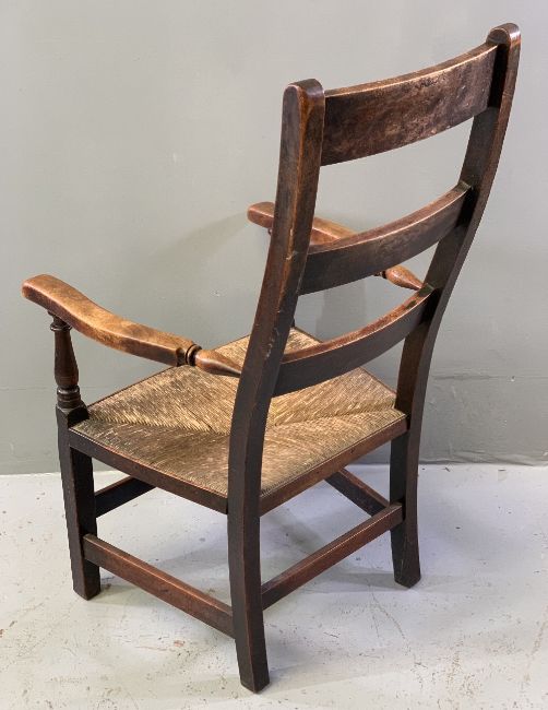 ANTIQUE ELM RUSH SEATED LADDERBACK FARMHOUSE ARMCHAIR, 108cms H, 56cms W, 44cms D the seat