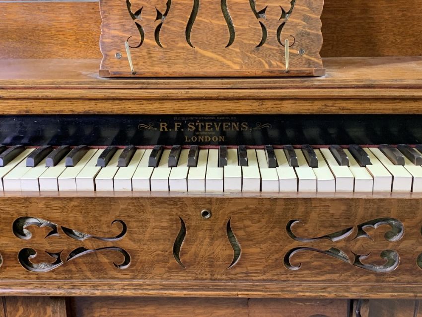 CIRCA 1900 OAK CHAPEL TYPE ORGAN by R F Stevens, London, having a shaped crested top with central mirror and sheet music stand, side carry handles and twin bellows pedals, 139cms H overall, 109cms W maximum, 40cms D