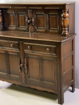 ERCOL OAK BUFFET SIDEBOARD with twin upper cupboard doors and bulbous top support detail over a base section of two drawers and two cupboard doors on stile feet, 125cms H, 123cms W, 48cms D