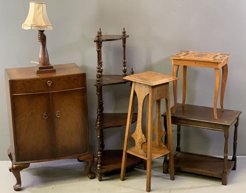 VINTAGE & LATER FURNITURE PARCEL, six items including a mahogany bow fronted side cabinet with single frieze drawer and twin lower cupboard doors, 80cms H, 60cms W, 40cms D, four tier reproduction corner whatnot, two tier oak planter stand, 79cms H, Italian inlaid musical sewing table with contents, two tier rectangular topped side table and a carved oak table lamp in the form of a hand holding a torch, 49cms H overall
