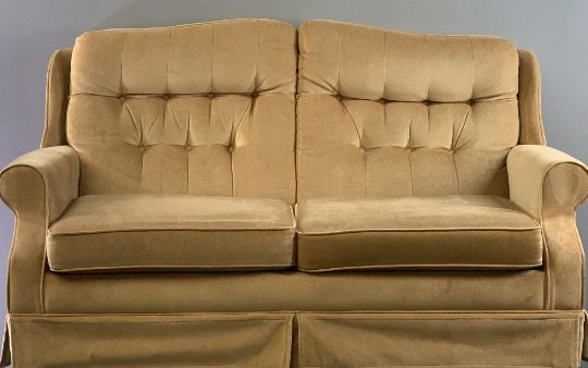 TWO SEATER SOFA BED, modern beige button upholstered, 83cms H overall, 152cms W, 56cms D the seat, 86cms D overall