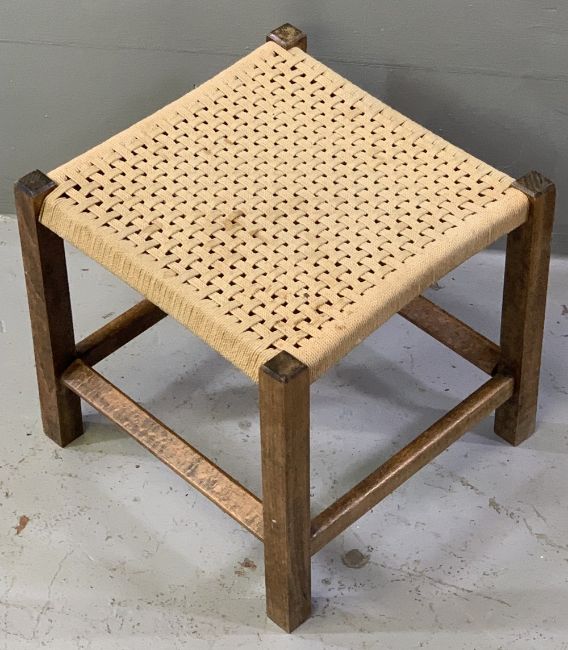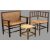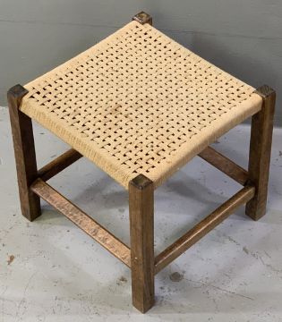 CHILD'S BERGERE CANE SEATED SETTEE, 64cms H, 70cms W, 41cms D rush seat bobbin corner chair, 64cms H, 41cms D, 41cms D and a string top footstool