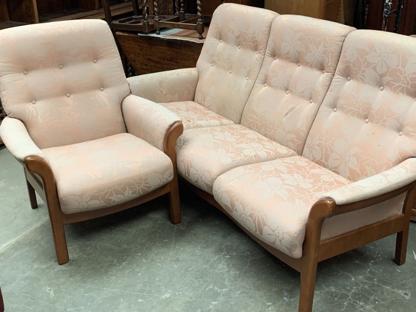 CONTEMPORARY STYLE TEAK CINTIQUE TWO PIECE LOUNGE SUITE of button back upholstered, ladderback three seater settee, 96cms H, 185cms W, 56cms D the seat and a single matching armchair, 97cms H, 81cms W, 57cms D the seat