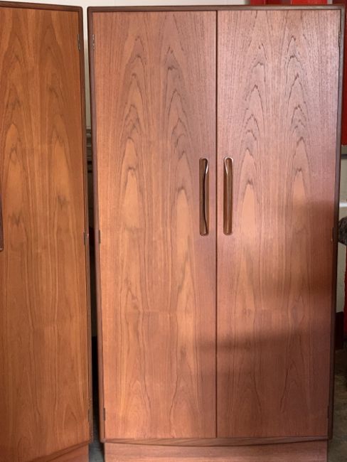 G-PLAN SEVEN PIECE TEAK BEDROOM SUITE, comprising triple door wardrobe, 175cms H, 122cms W, 59cms D, double door wardrobe, 175cms H, 91cms W, 50cms D, a long mirrored dressing table, 120cms H overall, 152cms W, 46cms D, six drawer chest, 104cms H, 56cms W, 45cms D and two single drawer bedside stands with connecting bar, 90cms H, 59cms W each stand, 45cms D along with a similar period stylish dressing stool