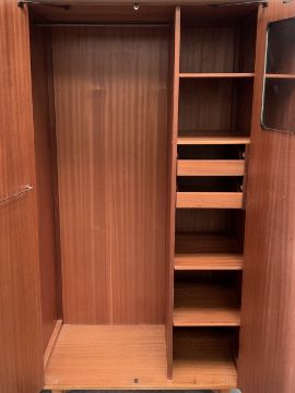 YOUNGER MID-CENTURY BEDROOM SUITE to include lady's and gent's fitted wardrobe, 178cms H, 128cms W, 56cms D and 178cms H, 96cms W, 56cms D and a dressing table, 148cms H, 132cms W, 52cms D