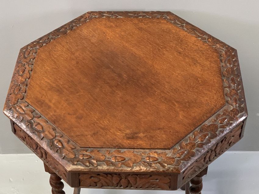 CARVED OAK OCTAGONAL TOP TABLE on barley twist supports having acorn and oak leaf detail to the top and frieze, 69cms H, 56 x 56cms top