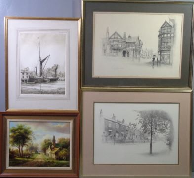 E VERNON oil on board - label verso titled 'Evening Shadows' depicting thatched buildings and figures on a track, 29 x 38cms, limited edition prints after GELDART, a pair - 37.5 x 53cms and a limited edition print after AIDEN KIRKPATRICK, 1977 - 39.5 x 29cms