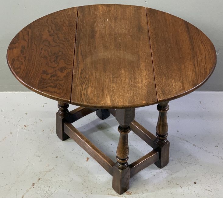 ANTIQUE & LATER SIDE TABLES (3) including a circular topped elm tripod table, 65cms H, 45cms diameter top, ball and claw foot coffee table set with six Victorian tiles decorated with butterflies, insects and flowers, 34cms H, 64cms W, 49cms D and a reproduction oak twin flap occasional table on turned and block supports, 47cms H, 67cms W, 57cms diameter fully open