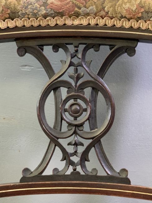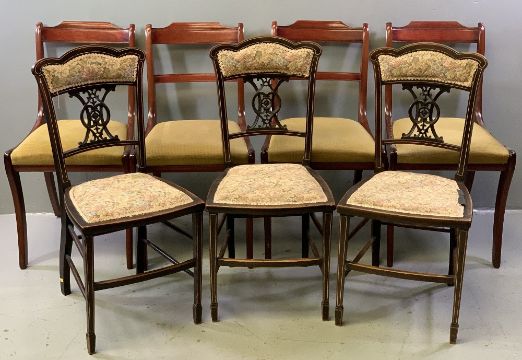 SALON & DINING CHAIR GROUP (3 plus 4), ebonized with bone stringing and carved central splat, 87cms H, 41cms W, 38cms D the seat, the others late 20th Century mahogany, Regency style with upholstered seat pads and 83cms H, 44cms W, 38cms D the seat