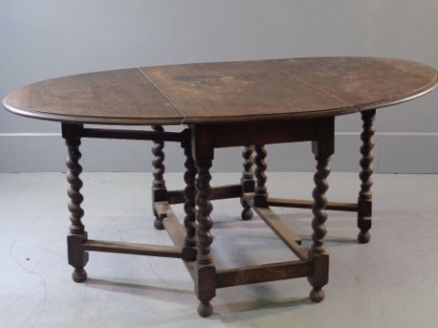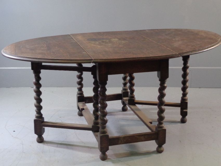 SUBSTANTIAL GATE LEG TABLE - period oak with barley twist supports, 74cms H, 167cms W (extended), 105cms D