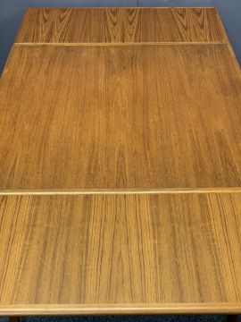 MID CENTURY TEAK DRAW LEAF DINING TABLE & 4 KARL HANSEN & SON DANISH CHAIRS - designed by Hans J Wegner with curved backs and upholstered seats, 74cms H, 87cms L closed, 87cms W, 157cms fully open and 75cms H, 52cms W, 39cms seat D, measurements respectively, all the chairs stamped to the seat bases