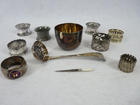 SMALL SILVER, 4 ITEMS, plated and other napkin rings, one bearing enamel badge for R M S Ranchi, the silver items include a circular bowl/cup, London 1791, Maker Richard Rugg, the front bearing faint horse and rider crest and indistinct inscription, 5.5cms H, 7cms diameter, gilt lined, Victorian sugar sifter spoon, London 1846, Makers Samuel Hayne & Dudley Cater and two Birmingham hallmarked napkin rings, various dates and makers, 5.8 ozt weighable