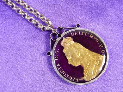 A VICTORIAN ENAMELLED CROWN - in a silver mount, 1891 with muff type chain (20grms), 56grms total