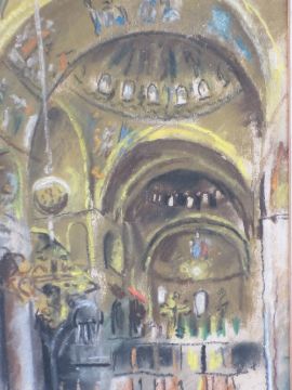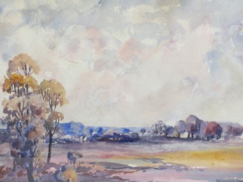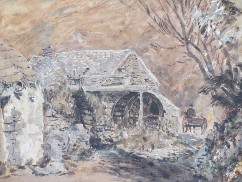 WINSTONE, 1949 watercolour - landscape view, 25 x 35.5cms, pastel of a church interior, 25 x 19.5cms and a 19th century watercolour - a watermill, 26.5 x 35cms