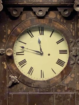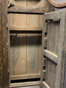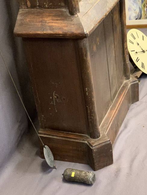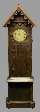 19TH CENTURY AUSTRIAN RAILWAY STATION LONGCASE CLOCK - pine cased architectural style having a wooden tiled pitch roof top with carved apron over a substantial case with glazed circular dial door flanked by three quarter round pillars and central door over a chamfered and shaped base with the pillar detail repeating, 14in circular dial set with Roman numerals and single wind aperture before a replacement brass single weight pendulum driven movement, weight, pendulum and keys included, colossal 259cms H, 73cms W, 39cms max D