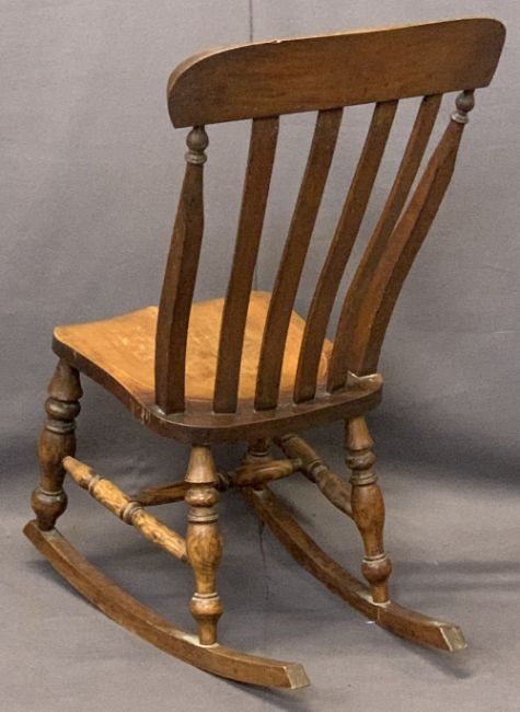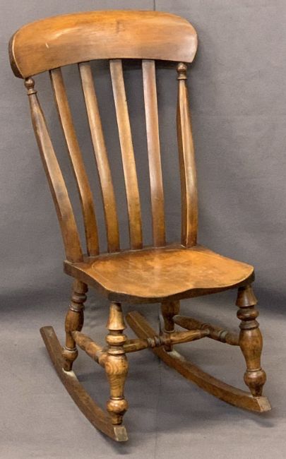 CIRCA 1880 FARMHOUSE ROCKING CHAIR - with curved and slatted back, on turned supports and stretcher, 94cms H, 51cms max W, 38.5cms seat D