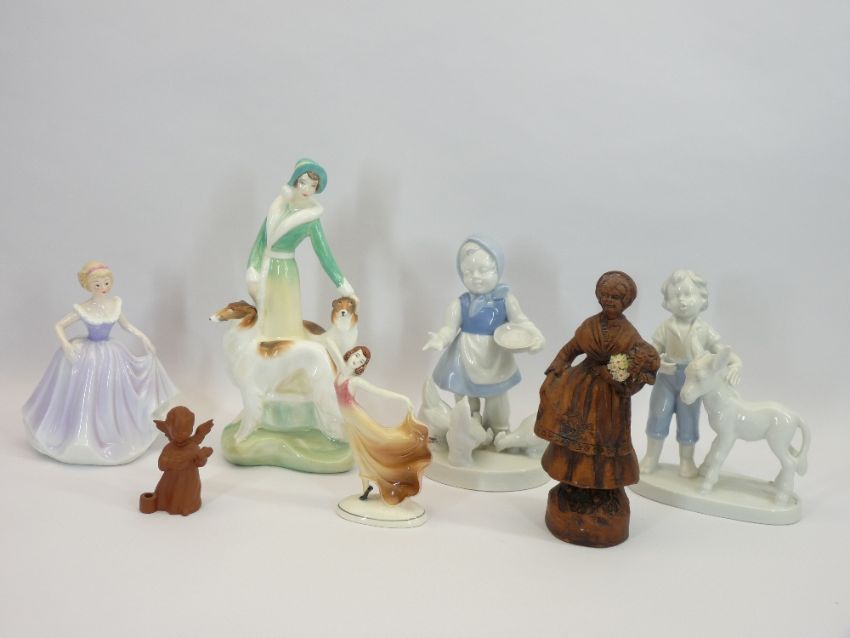 ENGLISH, FRENCH, GERMAN GROUP OF FIGURINES (7) to include Royal Doulton 'Daisy' HN3802, 'Katzhutte' Art Deco lady figurine, ETC