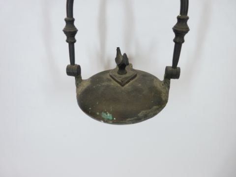 FRENCH MINER'S WHALE OIL LAMP - in cast iron and brass, 19th century with rooster screw finial to a circular font (repairs)