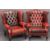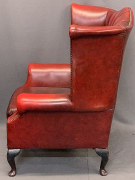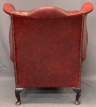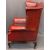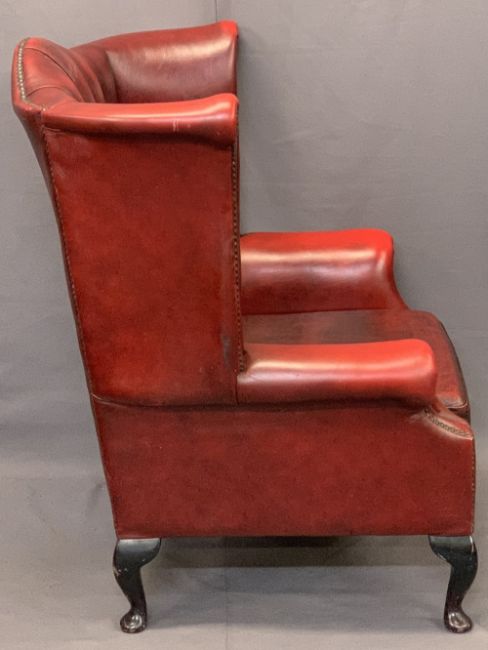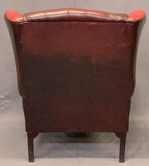 RED LEATHER EFFECT BUTTON UPHOLSTERED WING BACK FIRESIDE ARMCHAIRS (2) - 105cms H, 83cms W, 50cms seat D and 102cms H, 80cms W, 54cms seat D