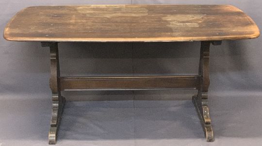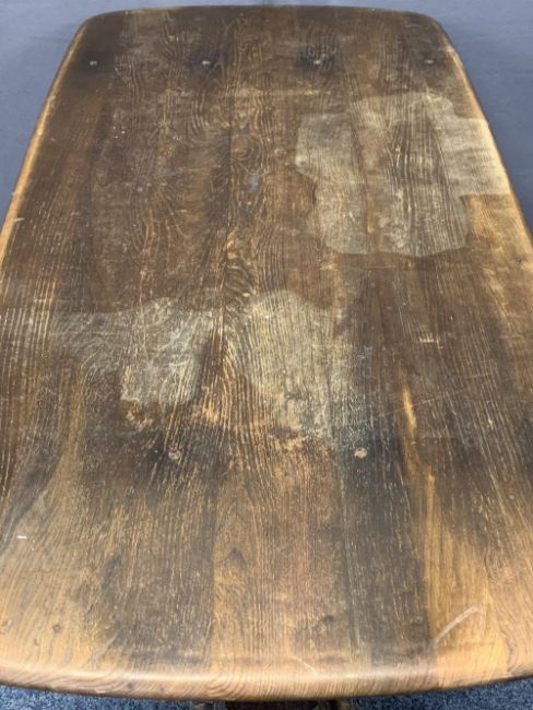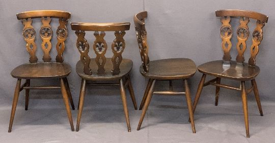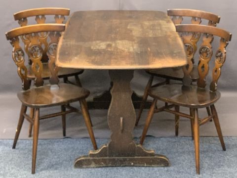 ERCOL DINING TABLE & FOUR CHAIRS, the chairs with triple splatback and Fleur de Lys decoration, 71cms H, 151cms L, 76.5cms W