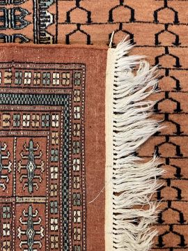 EASTERN STYLE WOOLLEN CARPET - rust ground with repeating central block and traditional patterned multi-bordered edge and tasselled ends, one end tassels removed, 254 x 160cms