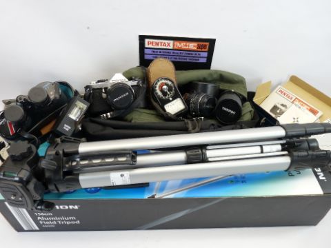 MIXED CAMERA EQUIPMENT & LENSES, boxed aluminium field tripod and a pair of cased Swift Grand Prix Mk 1 8x40 binoculars, the camera equipment includes a Western Master universal exposure meter Model S74/715, a Pentax ME Super SLR camera, additional lenses, ETC