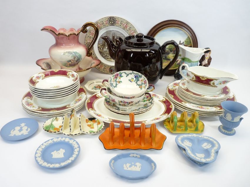 MIXED CHINA & POTTERY GROUP to include a barge style teapot and cover, Shelley, Carlton and Burleigh ware toast racks, Wedgwood Jasperware trinket dishes and other decorative items including 22 pieces of Wedgwood & Co Victoria dinnerware