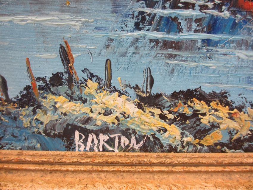 TIM BULMER watercolour titled - 'Bombs Away' depicting a First World War bi-plane pilot and BARTON oil on canvas - of a harbour inlet with boats in the style of Donald Blagge-Barton (20th Century), 33 x 21.5cms and 28.5 x 38.5cms measurements respectively