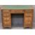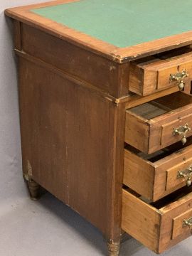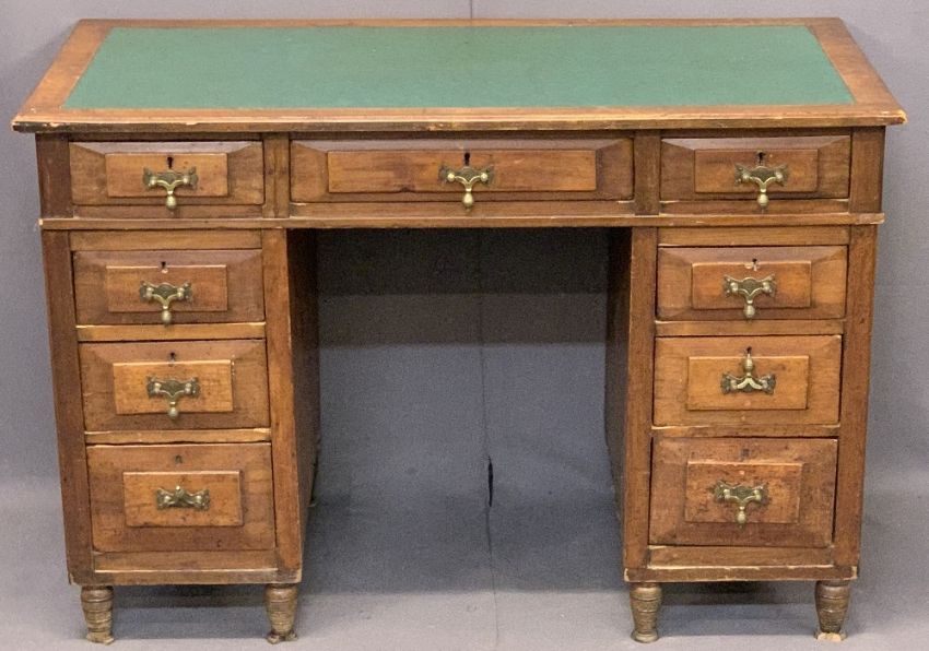 NEATLY PROPORTIONED TWIN PEDESTAL DESK - having inset green leatherette surface over three frieze drawers and twin banks of three drawers, all having stylish brass drop handles on turned corner supports, 71cms H, 105.5cms W, 55.5cms D