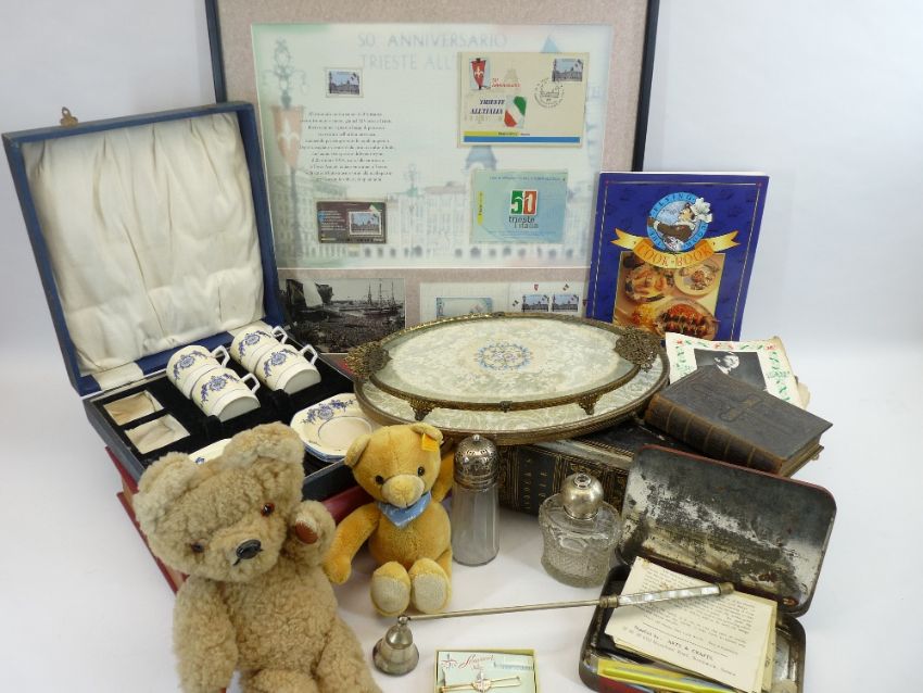 ECLECTIC PARCEL to include framed commemorative Tribute to Trieste Piazza, soft toys, old bibles, dressing table items, ETC