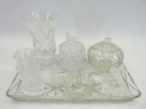 DRESSING TABLE GLASSWARE, CUT GLASS VASES, ETC