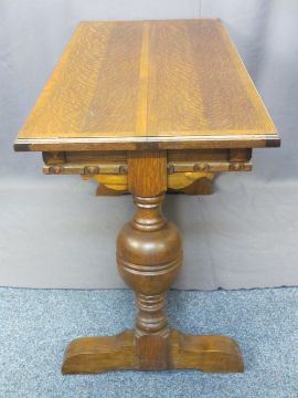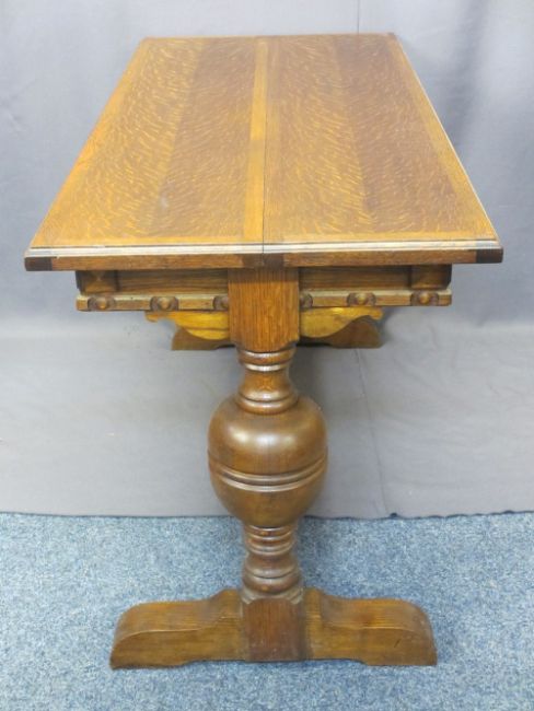 VINTAGE OAK Ee-ZI-WAY ONE MOTION EXTENDING TABLE - side pull action with fold out central leaf, carved frieze detail and bulbous supports with lower central stretcher, 76cms H, 136.5cms L, 60.5cms W closed, 94.5cms fully open