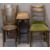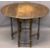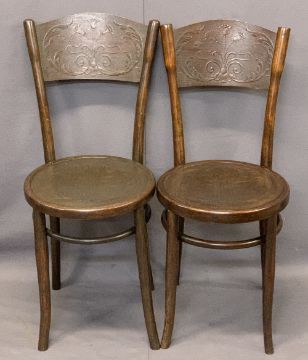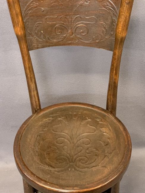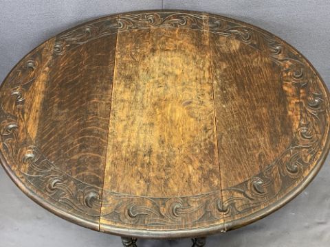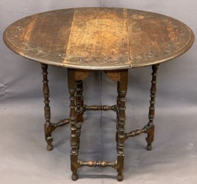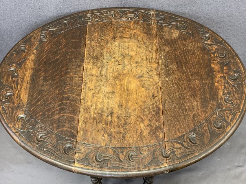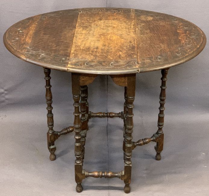 VINTAGE OAK GATELEG TABLE & FOUR CHAIRS (2+2) - the gateleg with carved detail to the top rim on busy turned supports and stretchers, 68cms H, 71.5cms L, 30.5cms W closed, the chairs being two Bentwoods with embossed detail to the back and circular seats, 88cms H, 37cms diameter the seat and a pair of oak ladderback chairs with upholstered drop-in seats, 86cms H, 44cms W, 38cms seat D