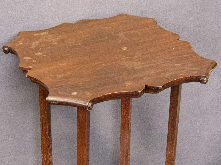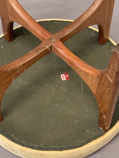 VINTAGE & MID CENTURY FURNITURE PARCEL, 4 ITEMS to include a mahogany Rogers Artist & Craftsman Paradise Square Oxford occasional table, the shaped top having knurled corners and under-tier shelf on splayed supports, 73.5cms H, 45.5 x 44cms top, G Plan teak upholstered circular top footstool, 43cms H, 50cms diameter with attached G Plan label, vintage oak ex dressing table mirror, oval format with bevelled edge glass, 53 x 74.5cms and a Stag mahogany single drawer bedside table (handle replaced), 57.5cms H, 42cms W, 32.5cms D