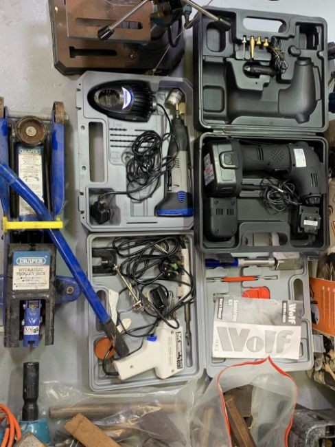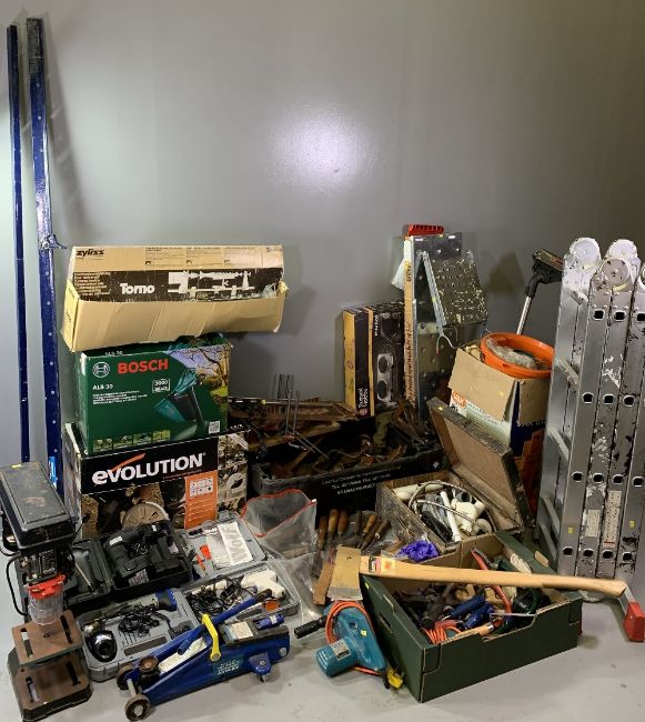 FERM PILLAR DRILL, Bosch blower, Evolution 12ins electric disc cutter for concrete, stone and brick, cased tools, trolley jack ETC, multi-purpose ladder/platform, VAX wet 'n' dry cleaner, an excellent parcel E/T