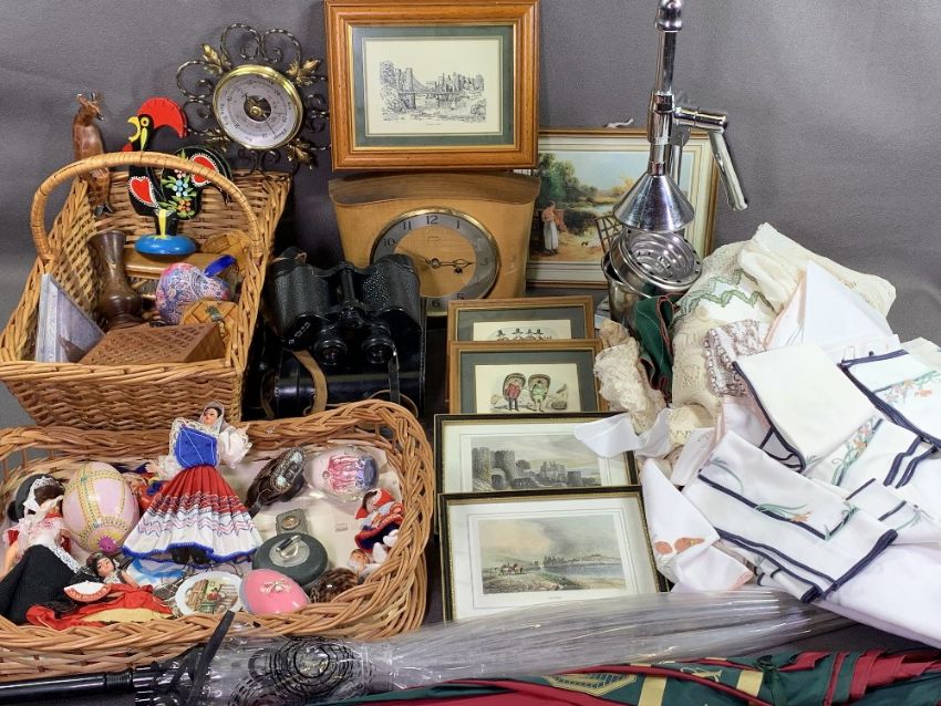 ART DECO STYLE MANTEL CLOCK by Smiths, 18cms H, 10.5cms W, 26cms D, cased Russian binoculars, chrome kitchen fruit juicer, prints, assorted linen, dolls, wicker basket ETC