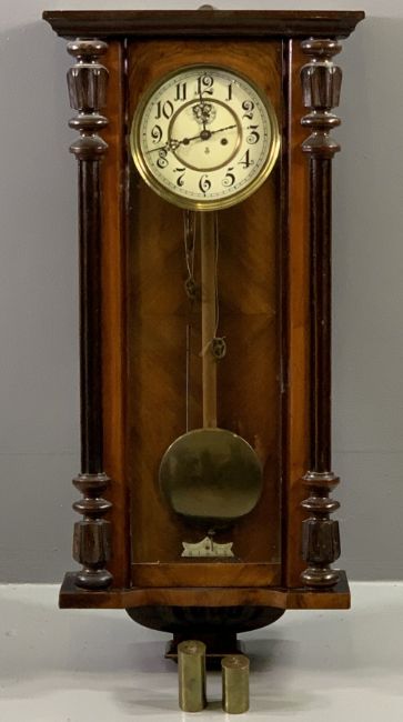 VIENNA PENDULUM WALL CLOCK - painted dial with brass bezel, initialled 'G B' to the dial, with twin weights and pendulum, 94cms H, 43cms W, 16cms D