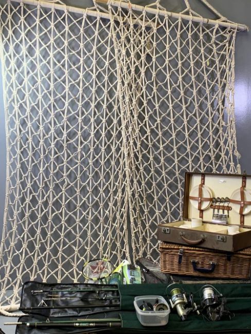 FISHING INTEREST - reels and cased rods, also vintage picnic sets, suitcases, two garden hammocks ETC