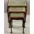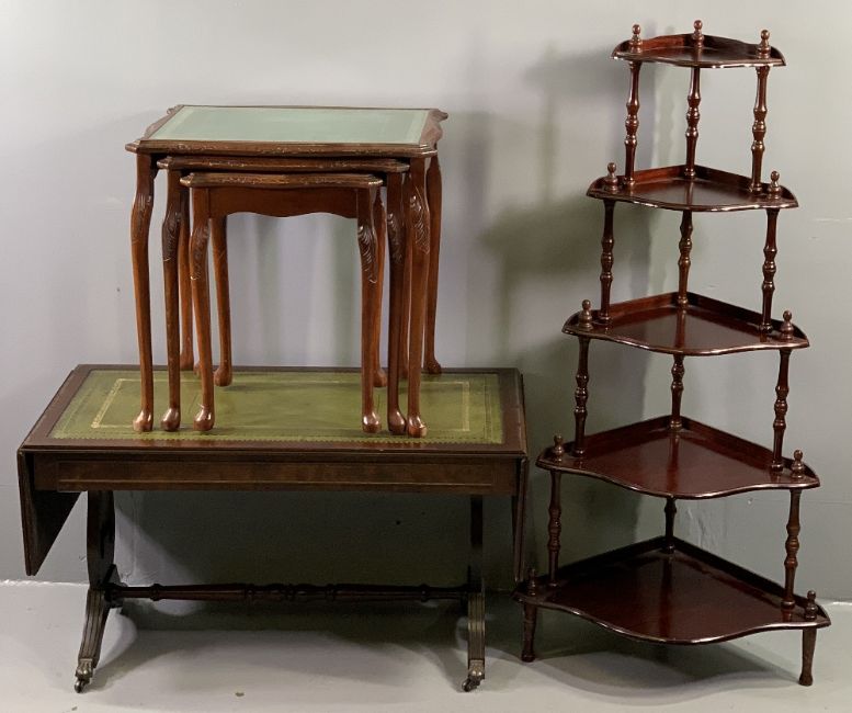 REPRODUCTION SOFA TABLE with tooled leather effect top and lyre ends, 50cms H, 94cms W, 48cms D (closed), a similar style nest of three tables and a corner whatnot