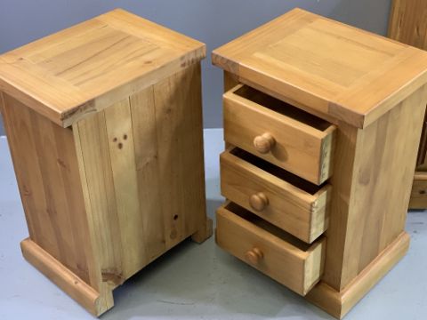 PINE BEDROOM FURNITURE - a pair of narrow chests of three drawers, 57cms H, 39cms W, 30cms D, another narrow chest, 64cms H, 47cms W, 49cms D also a wicker type linen basket and light wood swing mirror