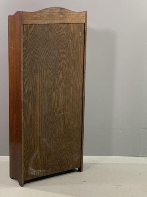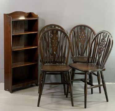 SET OF FOUR DINING CHAIRS, wheelback, 90cms H, 38cms W, 32cms D and a polished narrow five open shelf bookcase, 107cms H, 46cms W, 18cms D