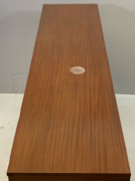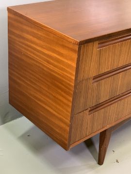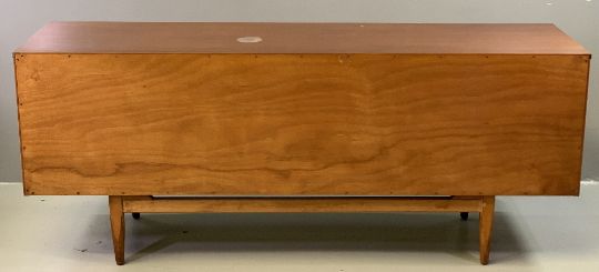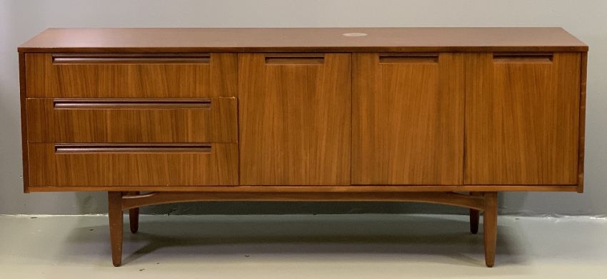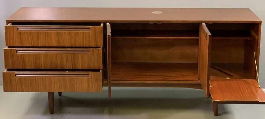MID-CENTURY TYPE SIDEBOARD with three drawers and three cupboard doors, 76cms H, 186cms W, 45cms D