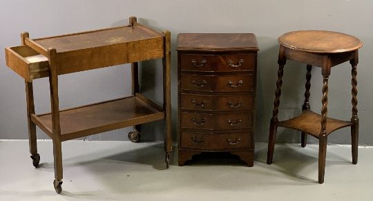 FURNITURE ASSORTMENT to include a bow fronted narrow reproduction chest, barley twist circular topped occasional table, teak nest of three tables, polished tea trolley, square topped side table and glass topped reproduction Long John and coffee tables