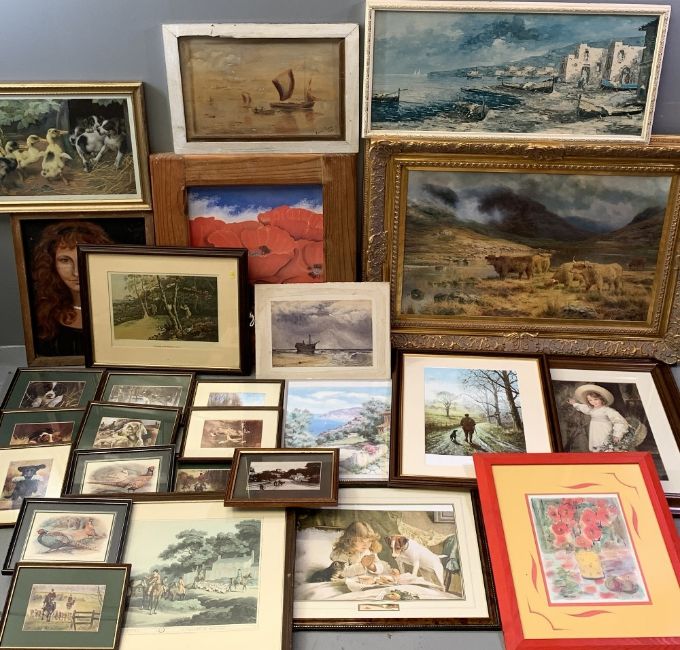 UNSIGNED WATERCOLOUR - beached boat beside choppy seas under dramatic skies, 19.5 x 28.5cms, quantity of Pears prints, large print of Highland Cattle in a good gilt frame and an assortment of other paintings and prints