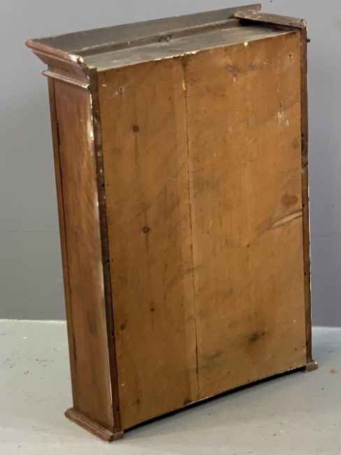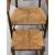 STRUNG SEATED ELBOW CHAIR with ladderback, 100cms H, 58cms W, 38cms D and a similar footstool, 30cms H, 38cms W, 30cms D, also an antique single glazed door wall hanging display cabinet, 77cms H, 57cms W, 18cms D