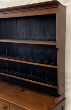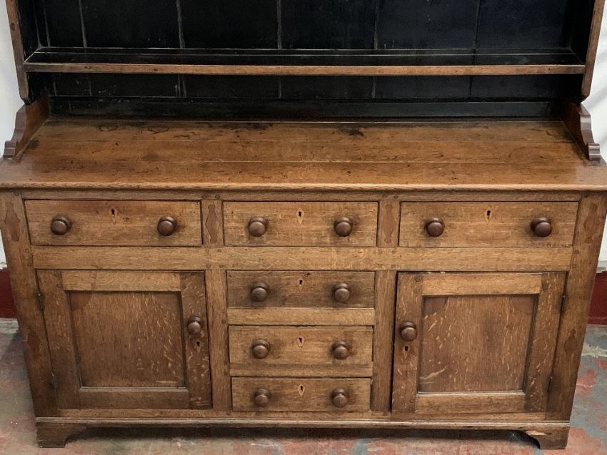NORTH WALES DRESSER having a three shelf rack over a T-Bank of three over three drawers and two side cupboard doors, all with turned knobs, 206cms H, 157cms W, 49cms D