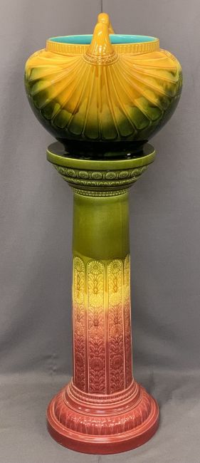 LARGE POTTERY MAJOLICA STYLE JARDINIERE - on similar style stand, 139cms overall H, 40 x 57cms the jardiniere, 99cms H the stand, no visible maker's marks but very much in the style of Betby