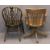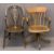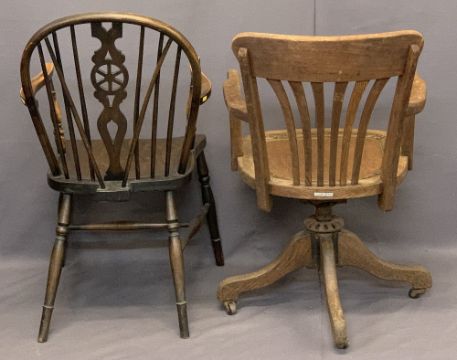 VINTAGE OAK SWIVEL OFFICE ARMCHAIR and a later wheelback spindle armchair on turned supports, 87cms H, 56cms W, 46cms seat D and 94cms H, 53.5cms W, 41cms seat D, measurements respectively