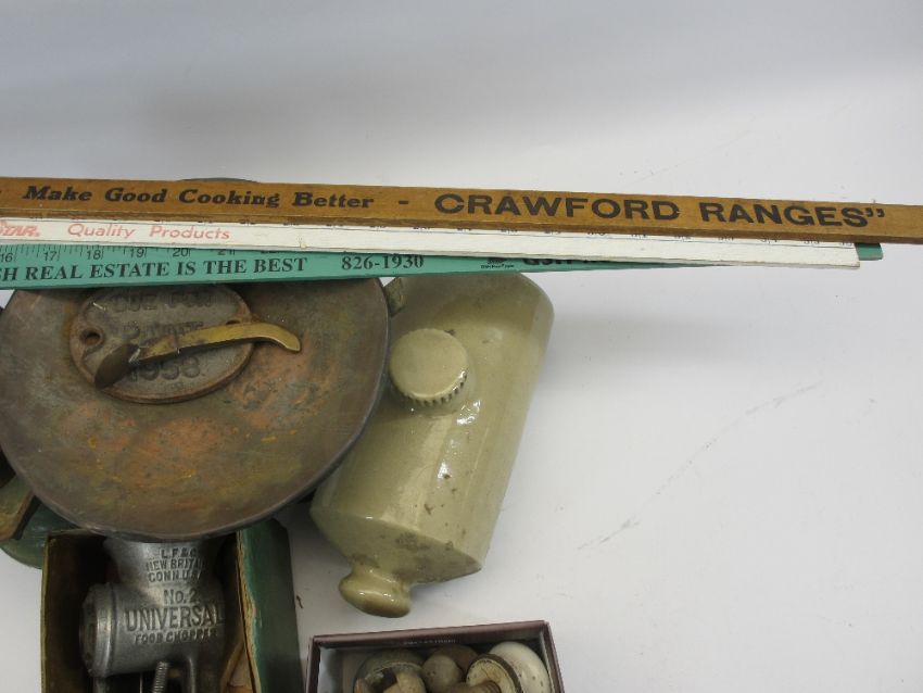 VINTAGE CAST IRON KITCHEN SCALES & WEIGHTS, Universal food chopper, porcelain and wooden furniture knobs, along with three advertising rules including a boxwood example 'Crawford Rangers make good cooking better' and verso 'You will always do better at Lindolns - 26 Pleasant Street, Concord, NH', another for G S H Real Estate and one for Servistar Quality Products, ETC